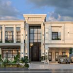 This stunning neo-classical residence embodies timeless elegance with its grand symmetrical facade and exquisite detailing. The use of natural stone, intricate moldings, and soaring columns evokes a sense of luxury and sophistication. Large floor-to-ceiling windows framed with black accents create a striking contrast against the light-colored exterior, allowing natural light to flood the interior while maintaining a classic aesthetic.