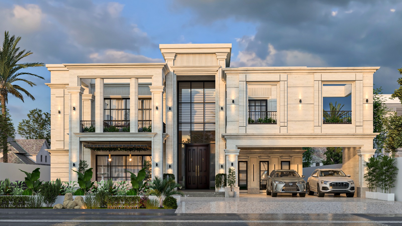 The central entrance, flanked by two imposing pillars, leads into a magnificent foyer, setting the tone for the refined interiors. Decorative wall sconces enhance the architectural beauty, illuminating the structure with a warm, inviting glow. Verdant landscaping and lush greenery soften the exterior, complementing the home’s regal presence.
