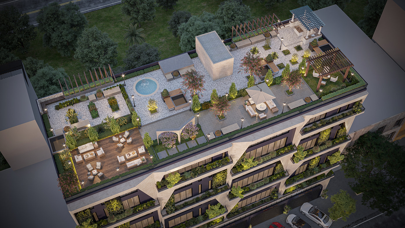 An inviting jacuzzi, ambient lighting, and landscaped pathways elevate the rooftop experience, making it ideal for gatherings, dining, or unwinding in a serene setting. With panoramic views and a seamless connection to nature, this rooftop is not just a space—it’s a modern sanctuary in the heart of the city.